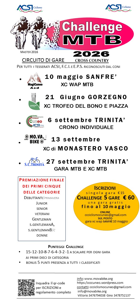 • BONIFICO intestato a Centro Coordinamento Ciclismo Cuneo Cassa di Risparmio di Fossano ag. Roata Rossi – IBAN IT45 S061 7010 2000 0000 1612 292 – causale ” CHALLENGE26″ + nome/i e cognome/i atleta/atleti